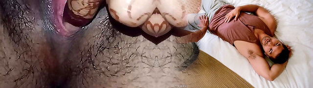Hairy bisexual stepmom and son-in-law teasing and mutual masturbation
