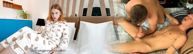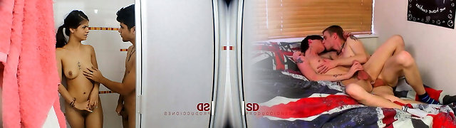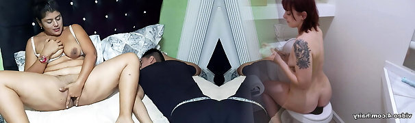 My step-dad hides in the closed room and sees us fucking so he joins us and makes us both jizm
