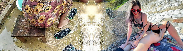 Curious Goddess milf small tits kissing spitting foot licking footjob rimjob unshaved pussy fucking