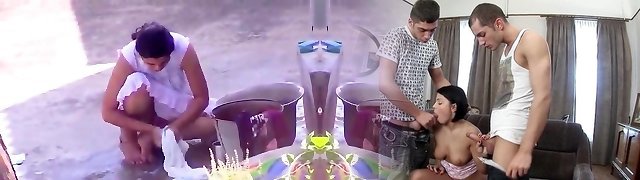While the Desi stepmom washes bra & undies, stepmom took off the stepson's trousers and Bare him, Then asks him to shag her - Cum