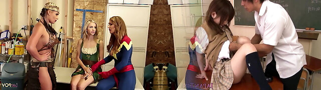 Cosplaying lesbos take advantage of the new blonde by starting a threesome crammed with eating ass and scissoring