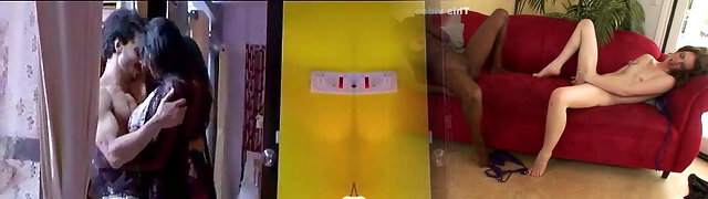 Indian honey gets pussy slammed rock hard by two dongs in couch